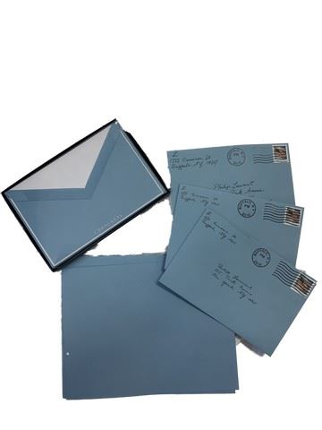 Lot of three blue envelopes addressed to Phillip (Bryan Cranston) from Lily, a box of Crane & Co. blue stationary envelopes and pile of blue stationary.