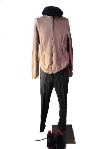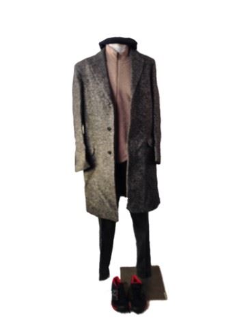 Phillip (Bryan Cranston) screen worn, hero, black and white wool tweed "Steven Allen" overcoat, tan long-sleeved "Burberry" woven knit sweater with stand up collar, grey wool and cotton blend "Vince" slacks(34), navy mesh "New Balance" sneakers with red piping around the sole(10), navy wool"Barney's" drivers cap. Wardrobe tag included. Worn in scenes 6-10.