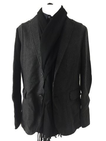 Phillip (Bryan Cranston) screen worn, hero, grey "Theory" wool blazer (40), dark blue "Vince" dress shirt (M), cashmere scarf with fringe, brown "J Crew" boot oxfords (10), black "Saks Fifth Avenue" gloves with grey fur lining. Wardrobe tag included. Worn in multiple scenes.
