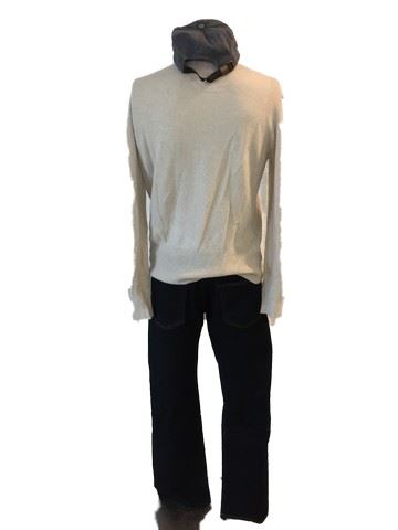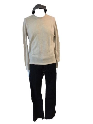 Phillip (Bryan Cranston) screen worn, hero, cream "Orley" cashmere sweater (m), dark blue "Adriano Goldschmied" jeans (34) "The Protege", "J Crew" faded light blue adjustable cap with brown leather strap. Worn in scenes 44. Wardrobe tag included.