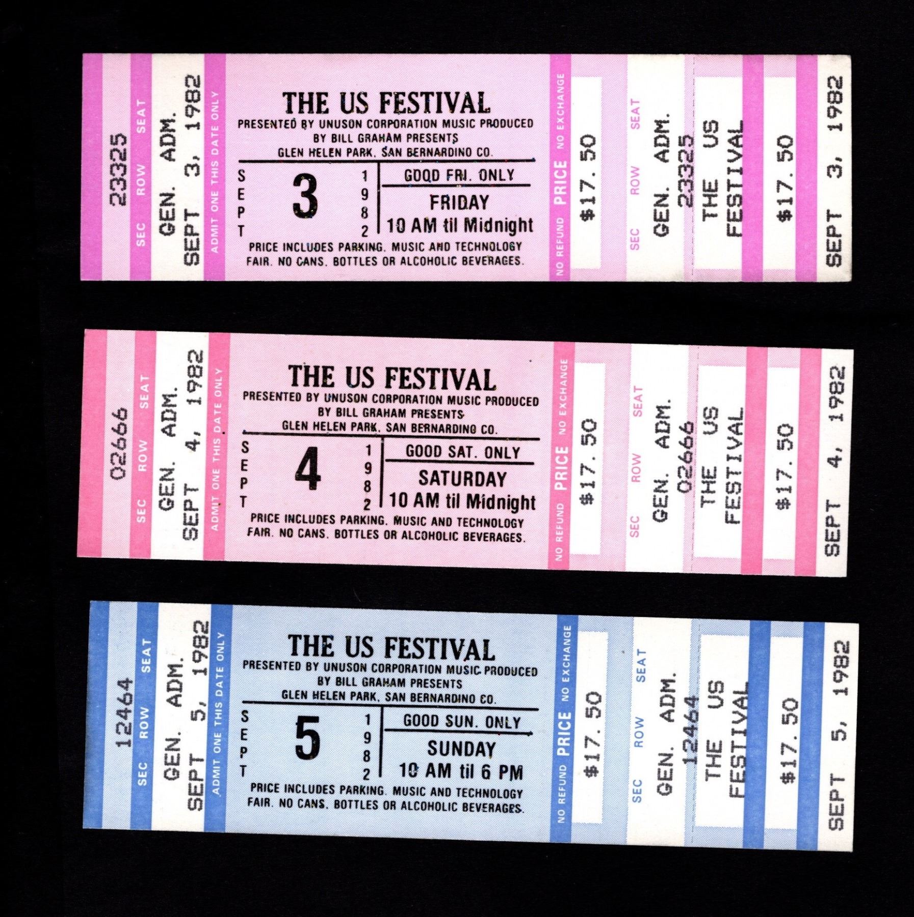 Complete unused ticket set from the first Us Festival, held September 3-5, 1982, in San Bernardino, California. Bands/acts included: The Ramones, The B-52's, Talking Heads, The Police, Santana, The Cars, The Kinks, Tom Petty, The Grateful Dead, Jimmy Buffett, Jackson Browne, Fleetwood Mac, and many others. Tickets are NR.MT-MT, and measure 1 1/2 x 5.