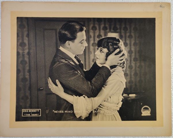 The Vamp (Famous Players-Lasky, Paramount Pictures; 1918) lobby card. Comedy, Drama. Starring Enid Bennett, Douglas MacLean, Charles K. French, Robert McKim, Melbourne MacDowell, J.P. Lockney. Directed by Jerome Storm. Some edge wear, some creases, some tears, tape. Fine. (11"x14").