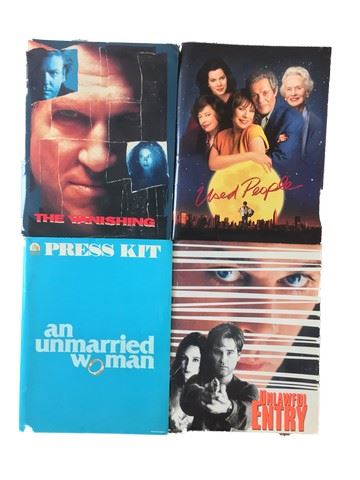 Collection of 4 press kits with black and white publicity stills included, sized mainly 8x10's from 20th Century Fox (1970's-90's). "Used People"(1992) starring Shirley MacLaine as Pearl Berman, Jessica Tandy as Freida, and Kathy Bates as Bibby Berman, 11 publicity stills included. "An Unmarried Women (1978) a romcom starring Jill Clayburgh as Erica Benton, Alan Bates as Saul Kaplan, and Michael Murphy as Martin Benton. "The Vanishing" (1993) a thriller starring Jeff Bridges as Barney Cousins, Nancy Travis as Rita Baker, and Kiefer Sutherland as Jeff Harrison, includes 9 publicity stills. "Unlawful Entry" (1992) a psycho thriller with a lonely policeman who develops a fixation on a married woman, leading to chilling consequences, starring Kurt Russell as Michael Carr, Madeline Stowe as Karen Carr, and Ray Liotta as Officer Pete Davis, 10 still included.