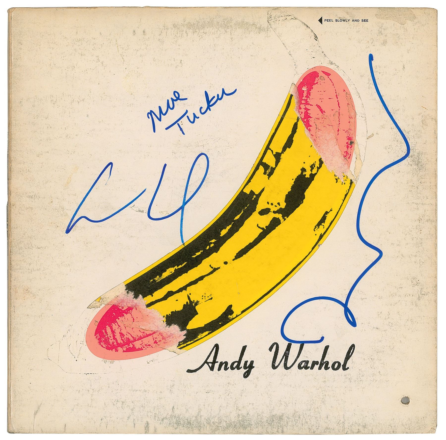 The Velvet Underground & Nico album signed on the front cover in blue felt tip by Lou Reed, Moe Tucker, and John Cale. In very good condition, with scuffing and soiling, a discount hole, and the banana sticker partially removed. The record is included.