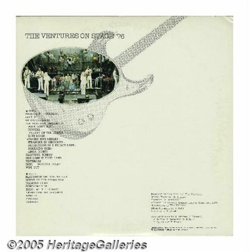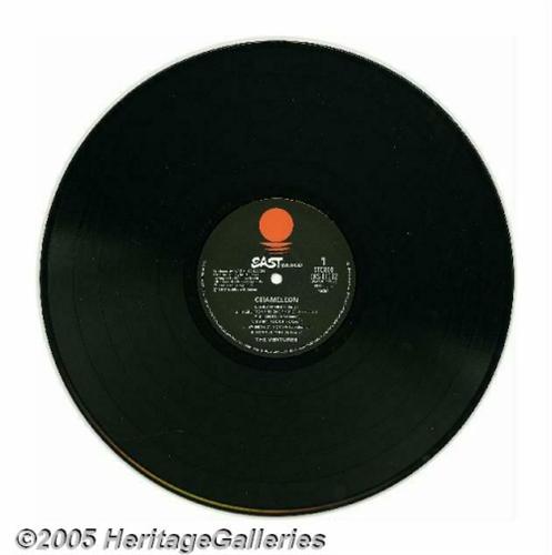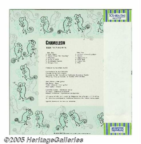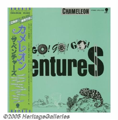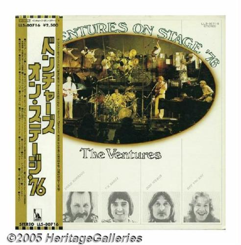 <B>The Ventures Japanese LPs Lot of 2.</B></I> The Ventures are absolutely revered in Japan, and there are dozens of albums by the group that were only ever released in that country. These are both live albums, and they're exquisite pressings, with the pure sound on virgin vinyl that Japanese recordings are known for. Each has the original insert and the strip of paper known as the "obi" still intact. The first record in this group is "Ventures on Stage '76" LLS-80716 Stereo. It's a white label promo copy. Interestingly, there are female vocals on the tracks "This Land Is Our Land," "Those Were The Days," and "Never Can Say Goodbye." Condition: M- (record) / VG++ (cover). The second is "Chameleon" EWS-81332 Stereo. This one has three extra musicians playing on the LP: Kazuhiko Katoh, Yu Imai, and Hideki Matsutake. Condition: M- (record)/ VG++ with small cut out at lower left edge (cover).