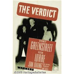 <B>The Verdict (Warner Brothers, 1946).</B></I> One Sheet (27" X 41"). This was the third screen version of Israel Zangwill's novel "The Big Bow Mystery" which featured the directorial debut of Don Siegel and the popular pairing of Peter Lorre and Sydney Greenstreet. This murder mystery is about a veteran Scotland Yard detective (Greenstreet) who loses his job when an innocent man is wrongfully hanged. But, when a mysterious murder occurs that baffles the new chief, Greenstreet and his friend Victor Emmric (Lorre), return to solve the case. There are light surface wrinkles, an extra fold line across the top border, a touch of separation at the crossfolds, and some pinholes. Fine+.