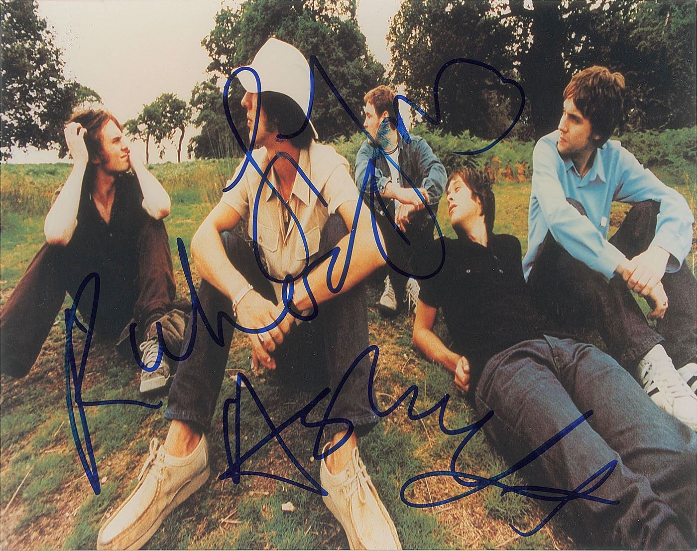 Color glossy 10 x 8 photo of The Verve as they're pictured on the front cover of their Urban Hymns album, signed in blue felt tip by Richard Ashcroft and Simon Jones. In fine condition.