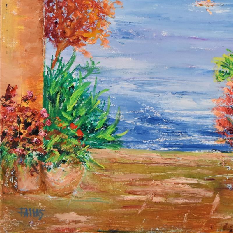 "The View" is an original oil painting on stretched canvas by Elliot Fallas, hand signed by the artist. Includes Letter of Authenticity. Measures approx. 16" x 20" (image). The sides of the canvas are painted and it can be hung as is, but a frame is definitely recommended.