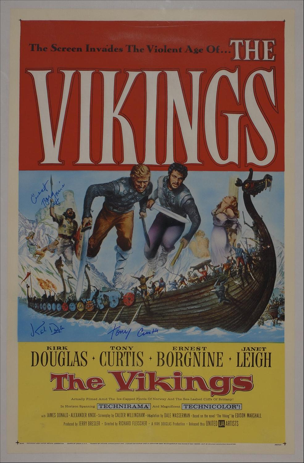 Color 27 x 41 one sheet movie poster for The Vikings, signed in blue felt tip by Kirk Douglas, Tony Curtis, and Ernest Borgnine. Poster appears to have been professionally cleaned and restored and is affixed to a slightly larger canvas sheet. Rolled and in fine condition.