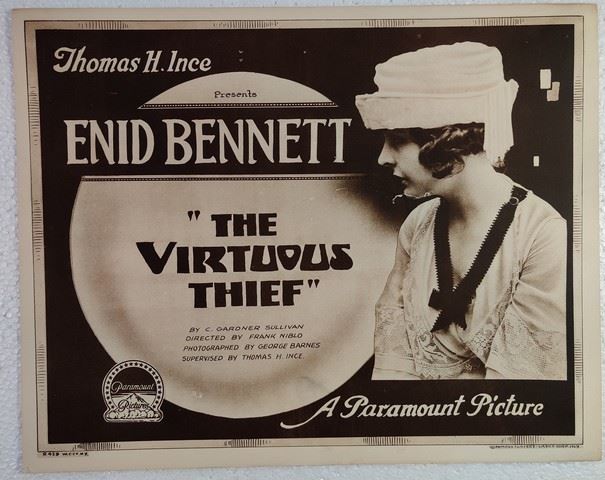 The Virtuous Thief (Paramount Pictures, 1919) lobby card. Drama. Starring Enid Bennett, Niles Welch, Lloyd Hughes, Willis Marks, William Conklin, Dorcas Matthews, Lucille Young, Andrew Robson. Directed by Fred Niblo. Very minor edge wear, very minor creases, tape. Near Mint. (11"x14").