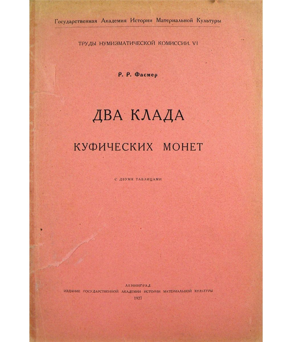 Vasmer, R.R. ДВА КЛАДА КУФИЧЕСКИХ МОНЕТ. Leningrad, 1927. Small 4to, original printed wraps. vii, (1), 57, (1) pages; 2 fine plates of coins. Spine taped; very good or better. Analyses the Vitebsk hoard of 1910 (61 coins, 22 Oriental) and the Ugodichi hoard of 1914 (148 coins, all Oriental). Very scarce.