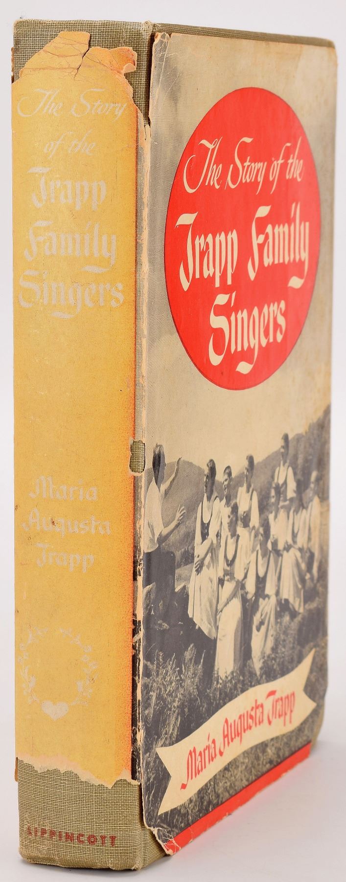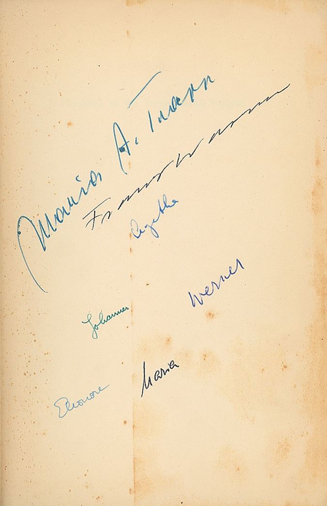 Signed book: The Story of the Trapp Family Singers. Eighth impression. Philadelphia: J. B. Lippincott Company, 1950. Hardcover with dust jacket, 6 x 8.5, 309 pages. Signed on the first free end page in ink and ballpoint, "Maria A. Trapp," "Maria," "Agathe," "Werner," "Eleonore," "Johannes," and "Franz Wasner." In very good condition, with staining to the end pages, pastedowns, and fore edges; the dust jacket shows tears, sunning, and paper loss.
