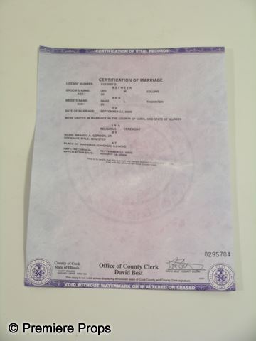 Paige (Rachel McAdams) and Leo (Channing Tatum) screen used, State of Illinois 'Certificate of Marriage'. (approx. 12" x 8 1/2")