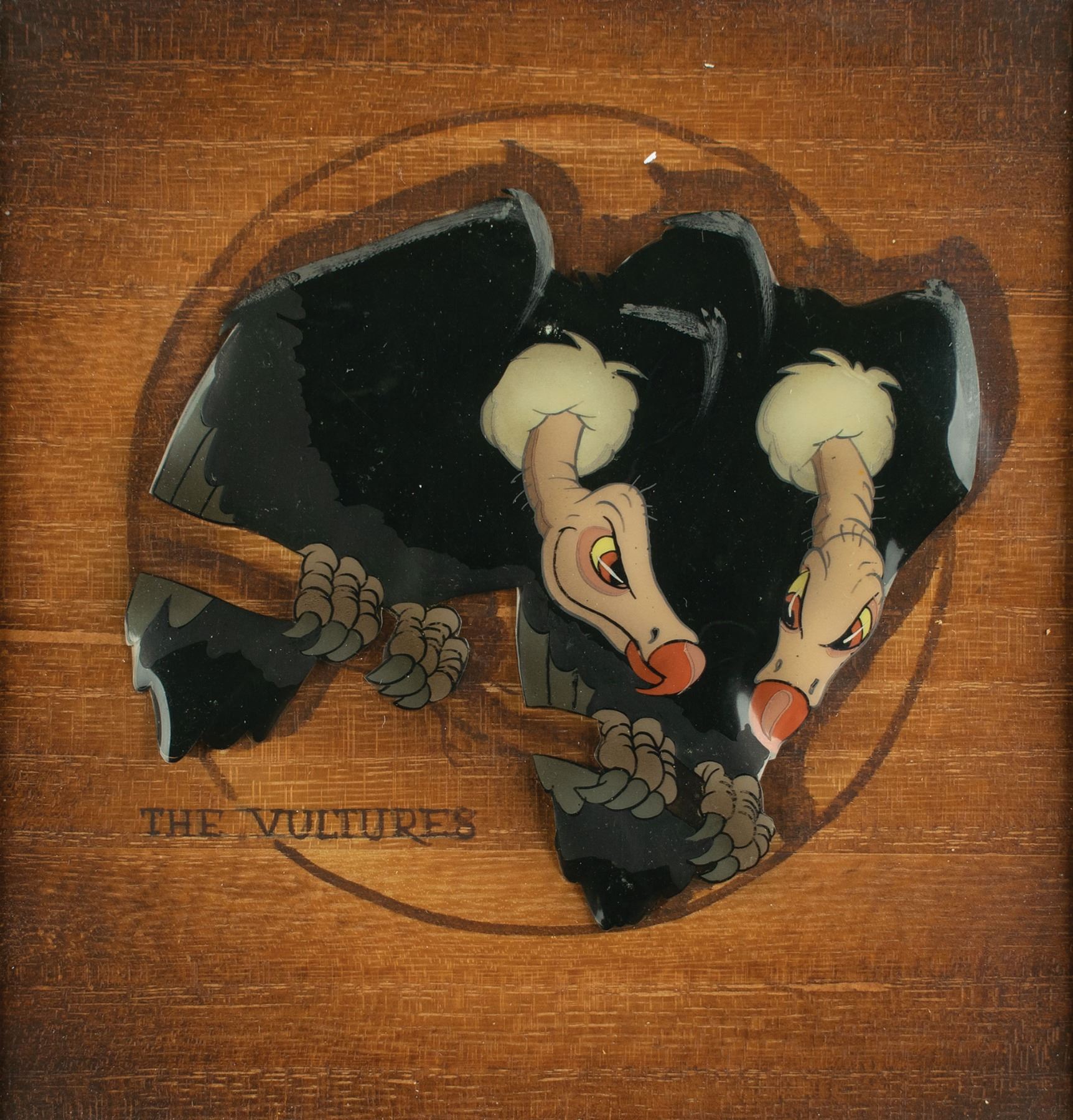 (Walt Disney Studios, 1937) Original production cel featuring the Vultures from Snow White and the Seven Dwarfs, which depicts the two large predatory birds perched menacingly on a large tree branch. The cel has been trimmed and applied to a woodgrain background as prepared by Courvoisier Galleries for sale. Total character image measures 4.25 x 3.5, with a mat opening of 5.25 x 5.5. Matted to an overall size of 12 x 14. Reverse bears a 1937 copyright label for Walt Disney Enterprises. In fine condition. The vultures are shown sparingly in Snow White, thus making their production cels exceedingly rare.