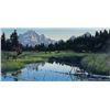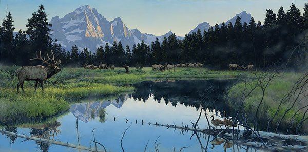 It is early fall in "Wake Up Call," the low sun bathes the mountains in alpenglow as mist rises off the water. This western scene is as familiar to Rod Frederick as his backyard and could be almost anywhere in the Rocky or Cascade mountain ranges. As a prelude to the approaching winter, the male elk (or bulls) gather female elk (or cows) on the way to the winter range. The number in each bull’s group is limited only by his ability to defend his mating territory. Hormones are flowing freely, as evidenced by the pair of fighting elks. “Sometimes I can get so caught up in the excitement of watching elk which are fifty feet away that I might not even see the Canada geese five feet from me,” says Frederick.