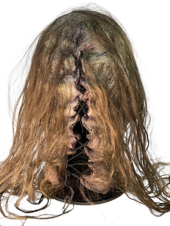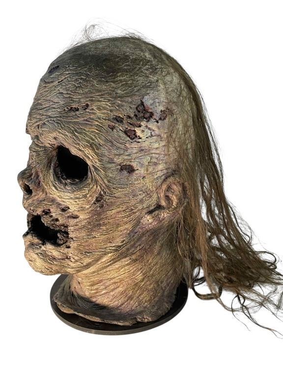 This piece was created by KNB Effect Group under the supervision of Greg Nicotero. This mask is made of foam latex and features a full head construction with an opened back that is held together with black string. The mask itself features beautifully cast in details, large eye and mouth sections, and hand punched hair. The mask has been expertly painted to resemble rotting and necrotic flesh that has been sewn together. This piece shows slight wear from use in the series but remains in excellent, screen used condition.