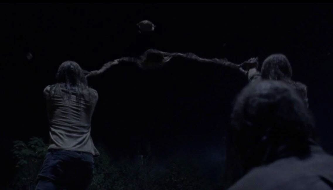 Later on, after the Whisperers begin the assault on the Hilltop the Whisperers cleverly use intestines as robes to catapult the bags of sap at the survivors and at the fence behind them. The survivors, who are busy fighting the horde, get soaked in sap and one mentions that it smells like a Christmas tree.