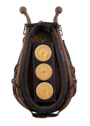 From the phenomenal TV series The Walking Dead (2010 - ) is this production used and acquired rusted and rubber outdoor large thermometer, barometer, and humidity dials. This was used in the making of the series and measures approximately 30" x 19".