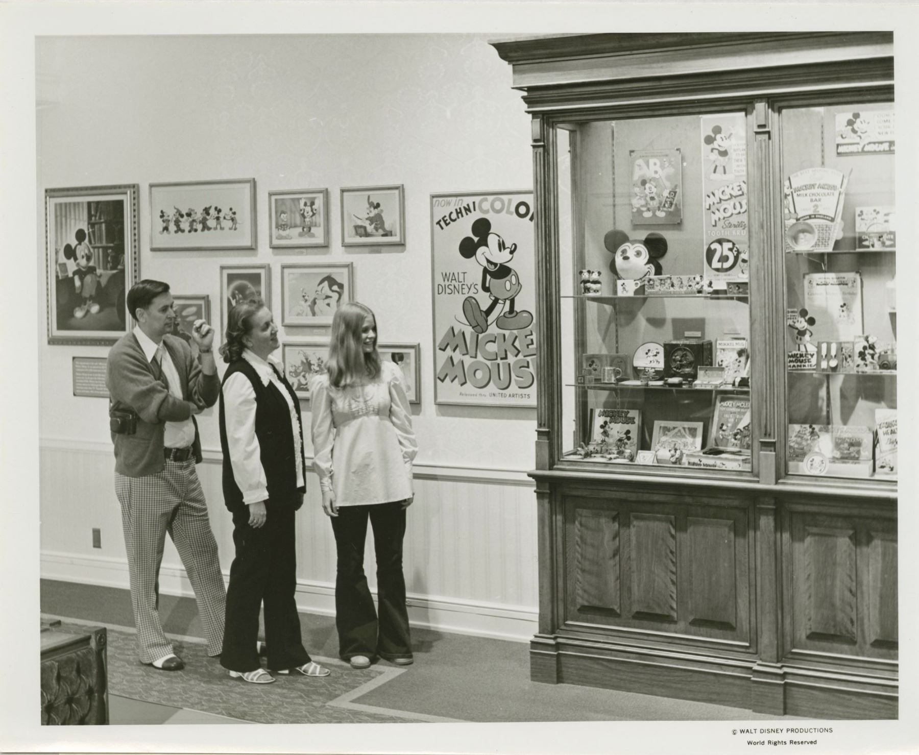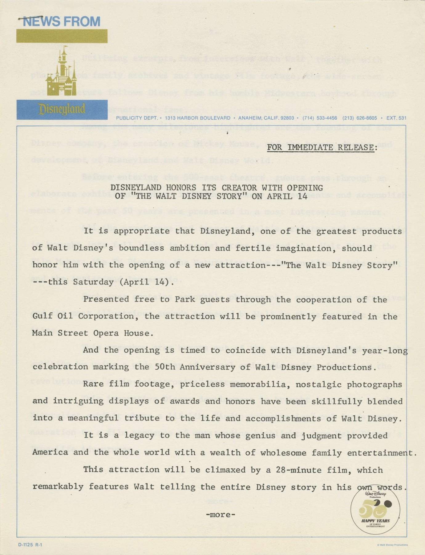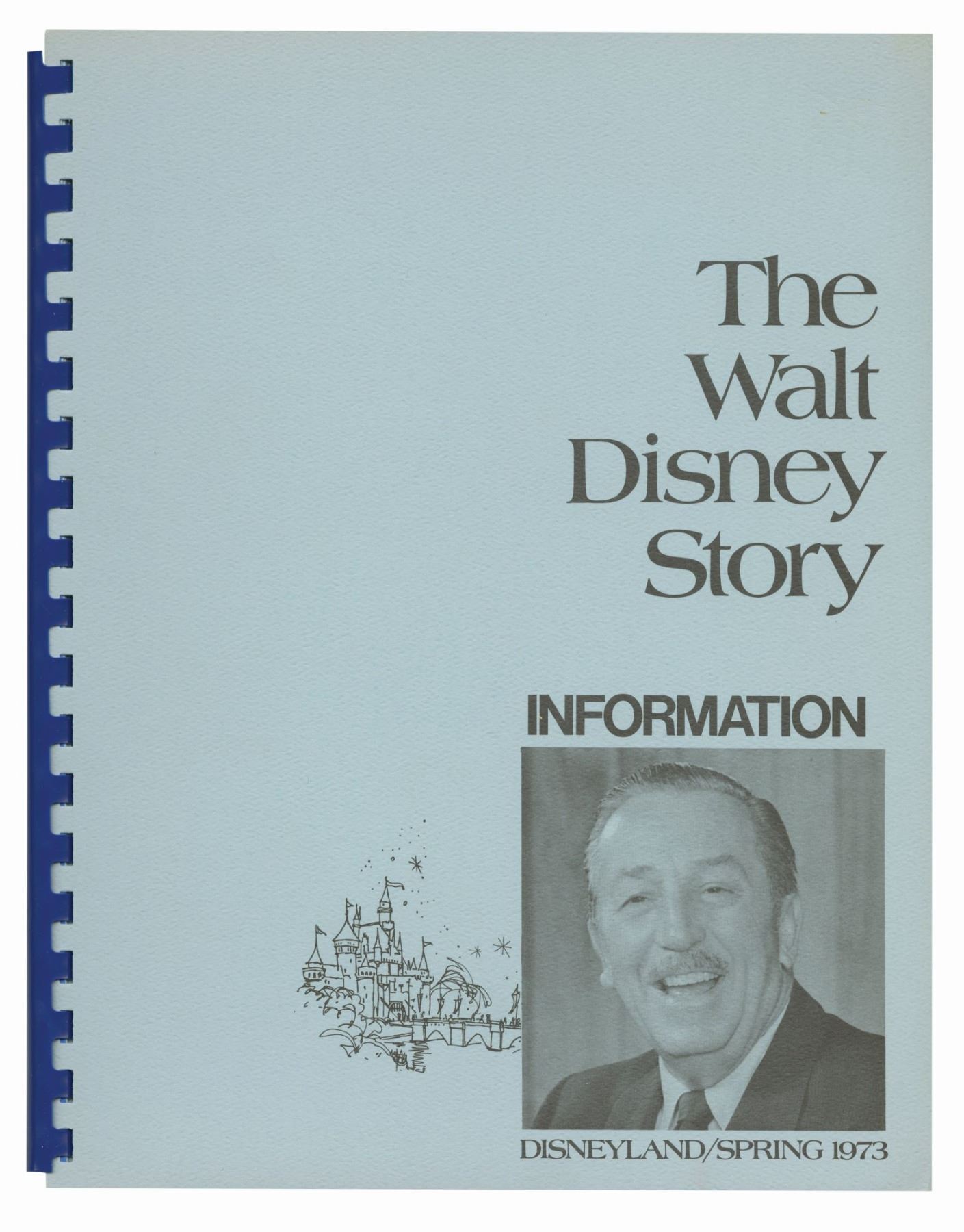 (Disneyland, 1973) A rare press kit folder from the opening events of The Walt Disney Story in 1973. The outer folder bears the attraction's name and a golden Sleeping Beauty Castle pattern. The packet includes: (2) 8"x10" black-and-white photos, a News from Disneyland press release, and a spiral-bound information packet with many pages of key facts about Walt Disney's life and career. The press folder measures 12"x9". The condition is very good with some wear throughout from use including some edge-wear along the spine of the press folder.