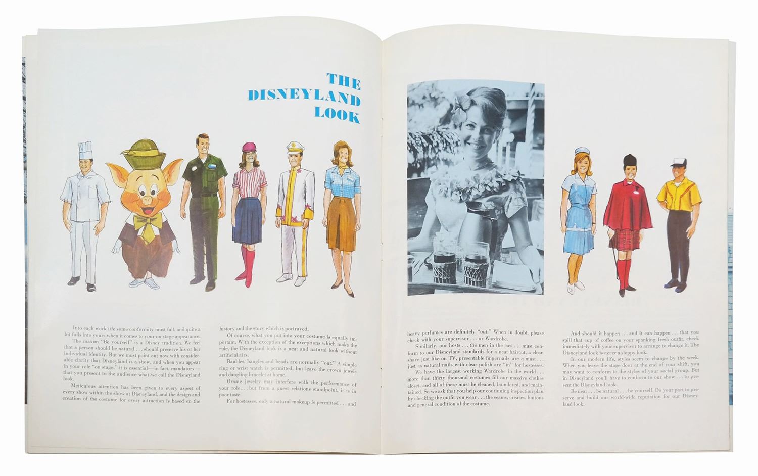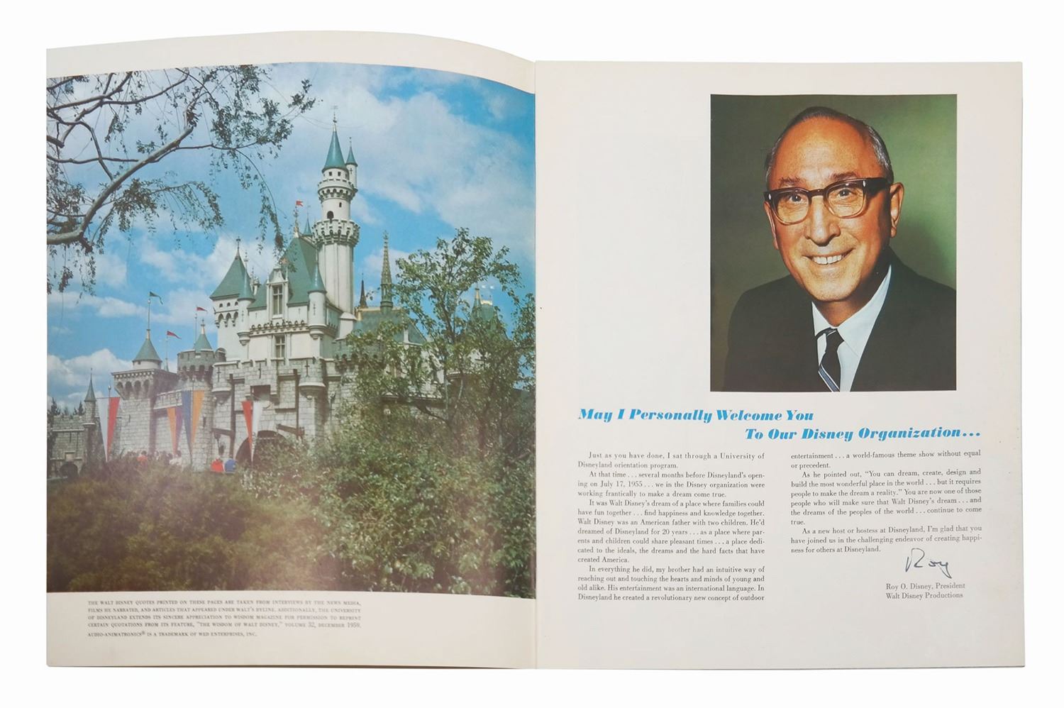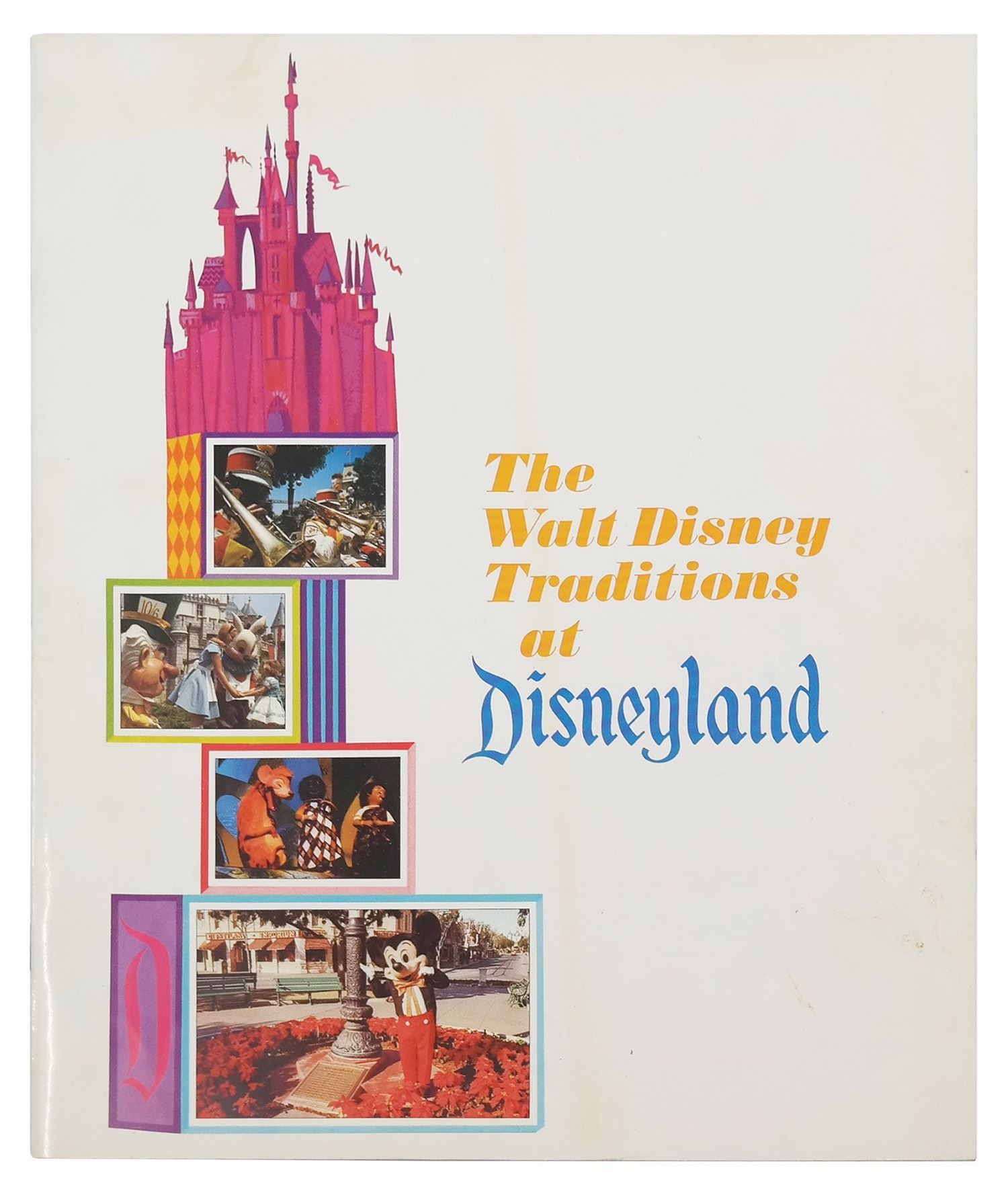 (Disneyland, 1967) An educational booklet distributed to new hires during cast member orientation at Disneyland. Created shortly after the death of Walt Disney, this booklet includes an introduction by Roy Disney and features many great photos of the history of Disneyland, as well as summaries of expected behavior as a cast member. Measuring 10.75"x9", the 25-page guidebook is in good condition with some spots of wear and minor discoloration to the cover from use, including some residue at the lower right.
