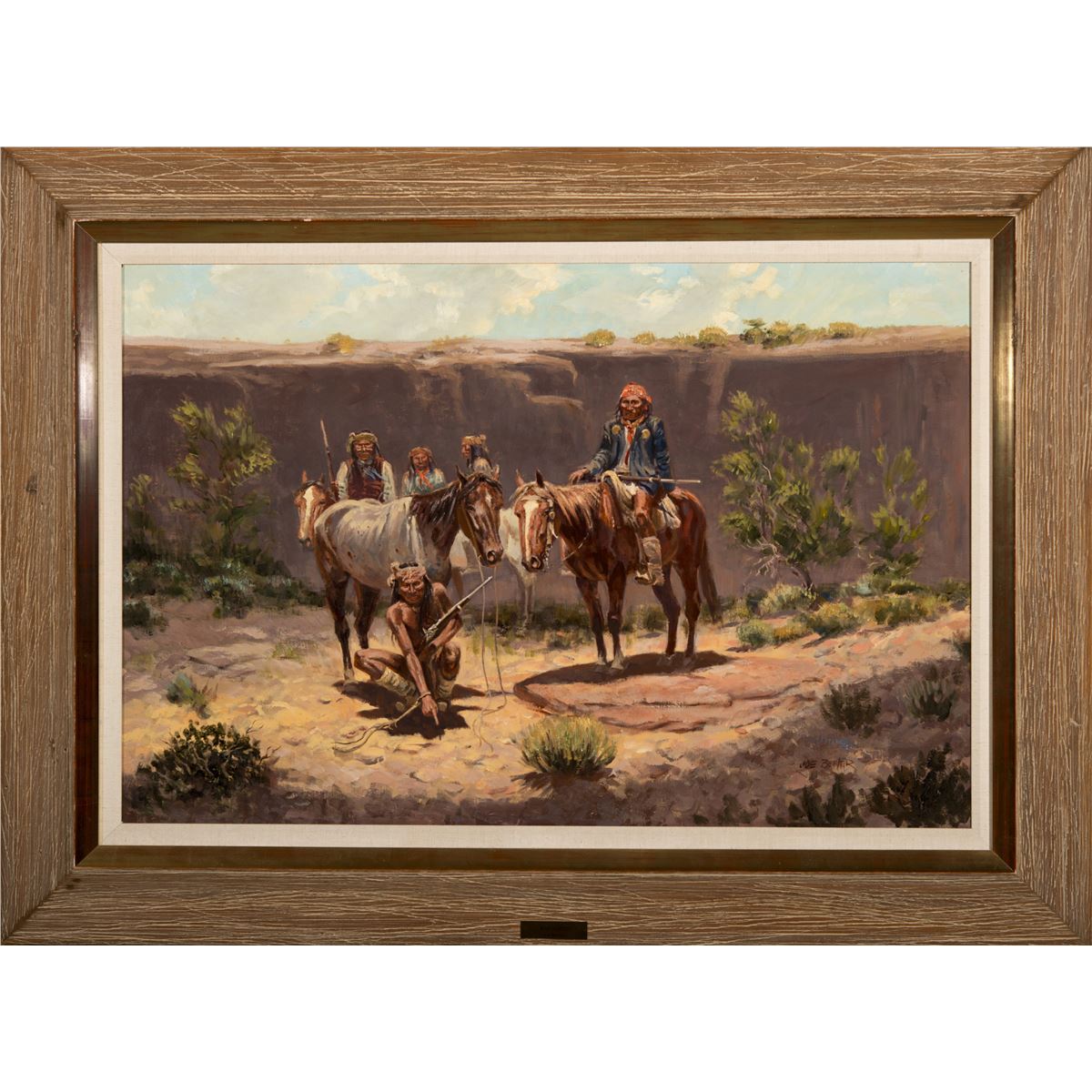 Joe Beeler grew up on the Oklahoma border, studied in Kansas and Los Angeles and made his living in commercial art before breaking through in 1960 with a one-man exhibition at the Gilcrease. Five years later, Beeler became one of the founding members of the Cowboy Artists of America. Beeler believed that “a really fine or great piece of western art will not only show care in the documentary aspects of the work, but it will also be a fine piece judged primarily on its merits alone.” The War Party is vintage Beeler, depicting a dismounted scout pointing out some minuscule clue to the trail they’re on. They are a patient crew, the members of this war party, carefully and deliberately moving through the scrub and rocks of the landscape.