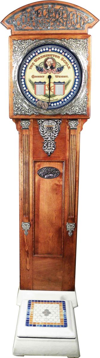 The Washington Penny Scale, made by Caille Bros. Co., Detroit, MI. Refinished mahogany cabinet with porcelain base. Arguably one of the most attractive penny scales ever made. Excellent restored condition, comes with key. 19 1/2 X 77 X 27 inches.