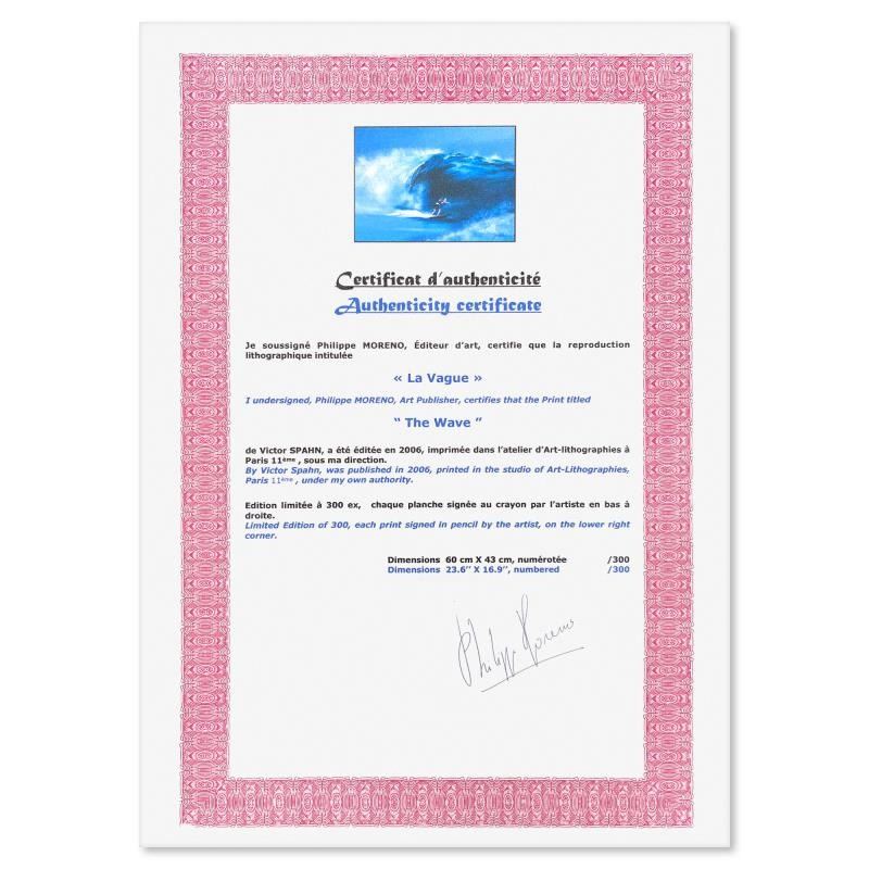 "The Wave" is a limited edition lithograph on paper by Victor Spahn. Printed at Art-Lithographies workshop in Paris, the piece is hand signed by the artist and comes with a certificate of authenticity. This piece is custom framed. Measures approximately 25" x 31.5" (frame), 17" x 23.5" (image).