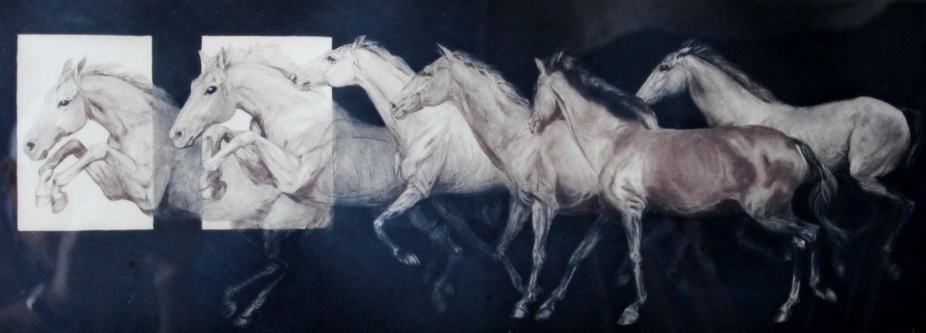 The Way Out by G.H. Rothe is a framed original mezzotint with horses jumping through the window as the way out. The size is 19 5/8" x 37".