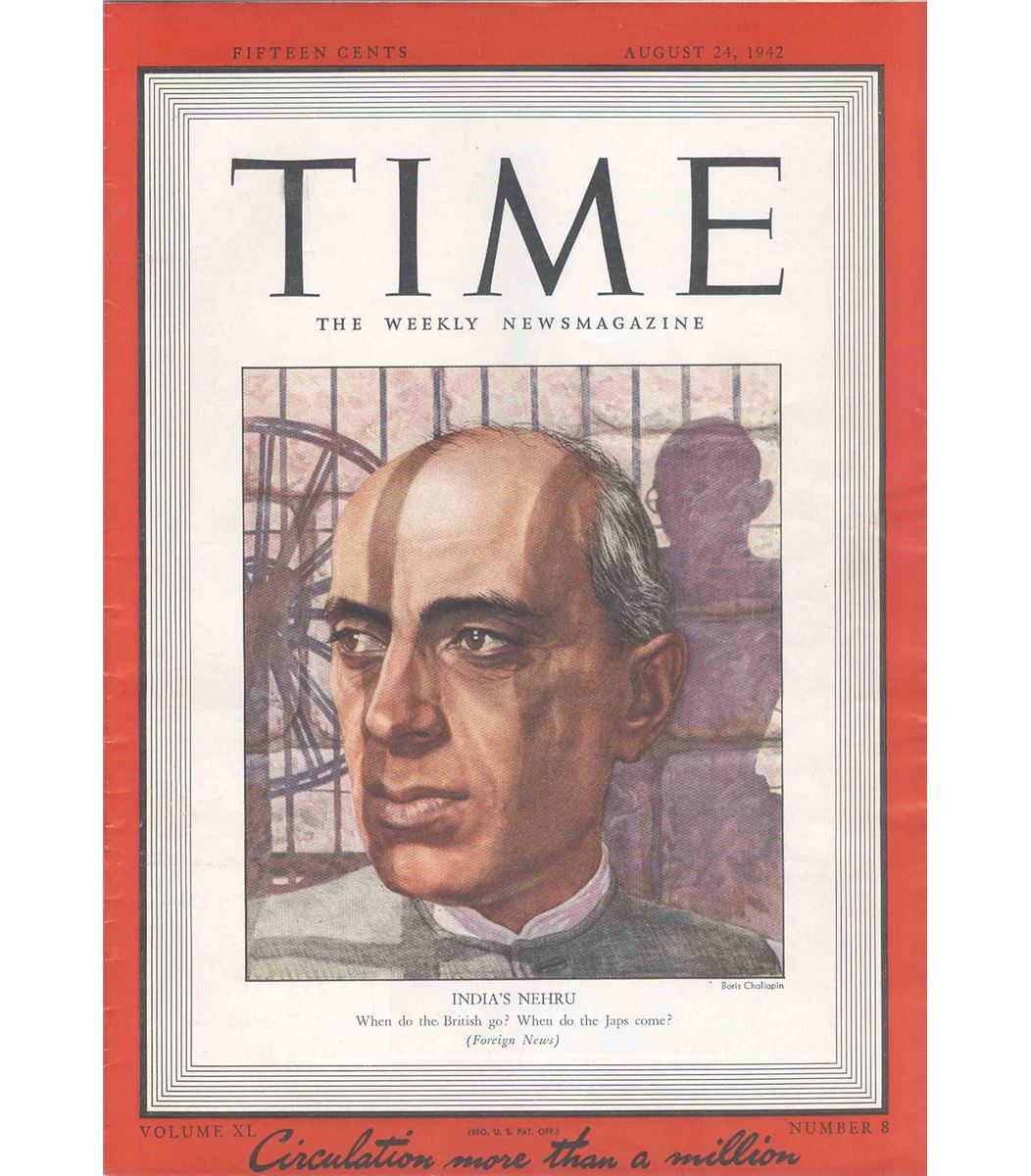 California, The Weekly News Magazine of Times of August 24, 1942, Nehru featured on the cover page and caption below "When do the British go? When do the Japs come", Page no. 20 and 21 dedicated to Nehru with picture of his Mother and wife details of Nehru life and relationship between British and Gandhi in very descriptive manner, Vol. XL No.4, about extremely fine condition.