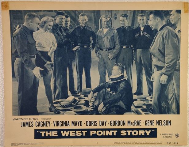 The West Point Story (Warner Bros., 1950) lobby card. Musical. Starring James Cagney, Virginia Mayo, Doris Day, Gordon MacRae, Gene Nelson, Alan Hale Jr., Roland Winters, Raymond Roe, Wilton Graff, Jerome Cowan. Directed by Roy Del Ruth. Very minor edge wear, very minor creases, tape. Excellent. (11"x14").