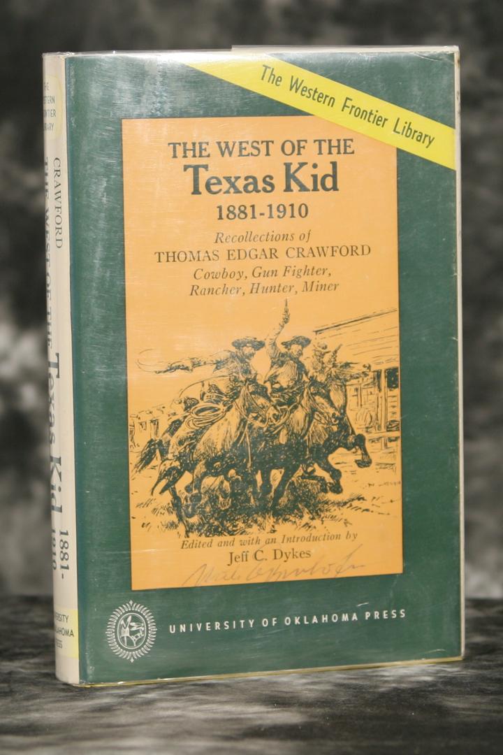 The West of the Texas Kid 1881-1910, recollections of Thomas Edgar Crawford - Cowboy, Gun Fighter, Rancher, Hunter, Miner. Edited with an introduction by Jeff C. Dykes. Illustrations by Nick Eggenhofer. Inscribed and signed by Dykes. Dust Jacket signed by Eggenhofer. Copyright 1962, University of Oklahoma Press.