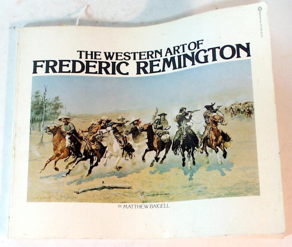 The Western Art of Frederic Remington by Matthew Baigell. Softcover. 1976.; 11" x 9". Good condition, slight roll but no crease. some text in the front, but mostly just reproductions of Remingtons art.