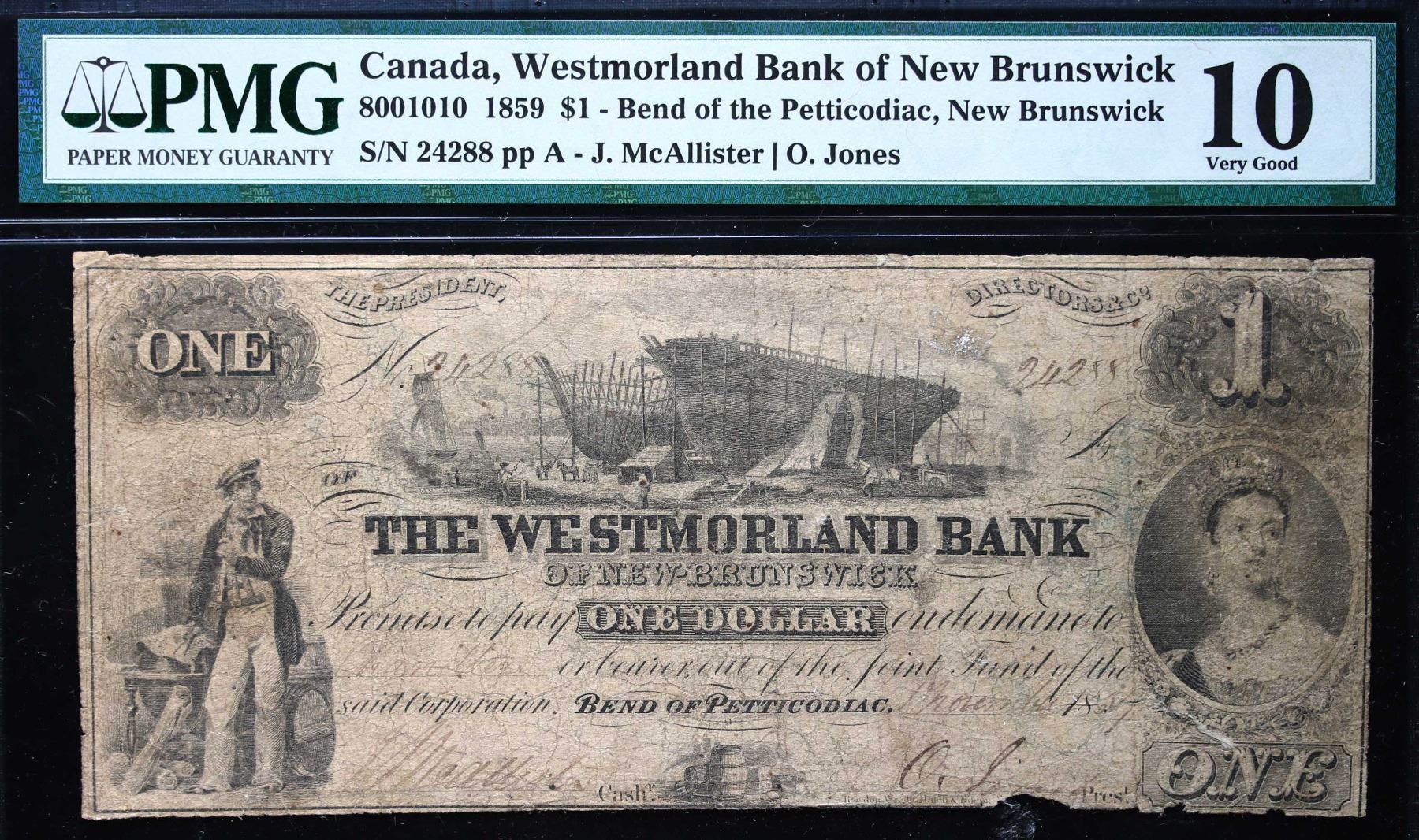 The Westmorland Bank of New Brunswick 1859 $1 #23618 CH-800-10-10 PMG VG10. Only 19 known notes. Rare issue.