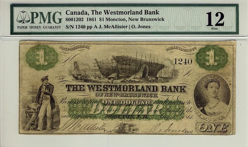 The Westmorland Bank of New Brunswick, 1861 $1 #1240, CH-800-12-02, PMG F12