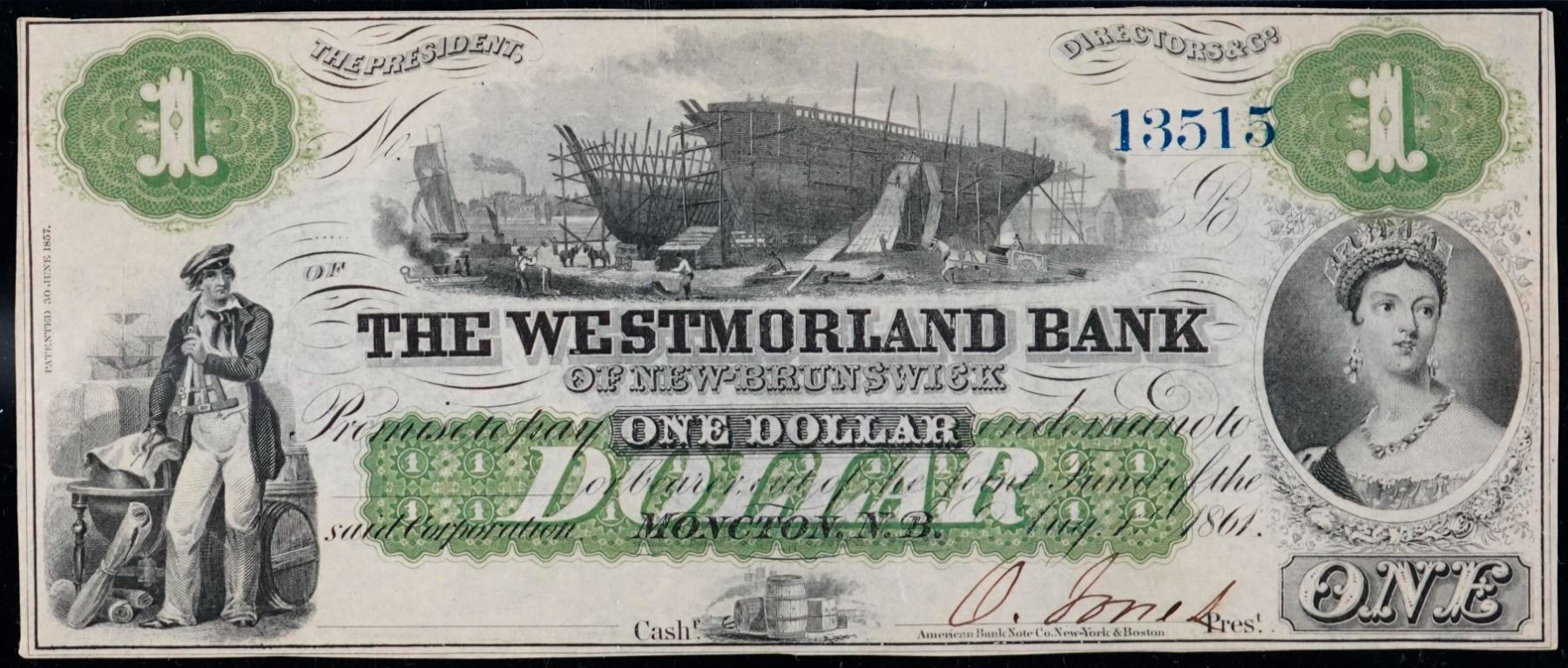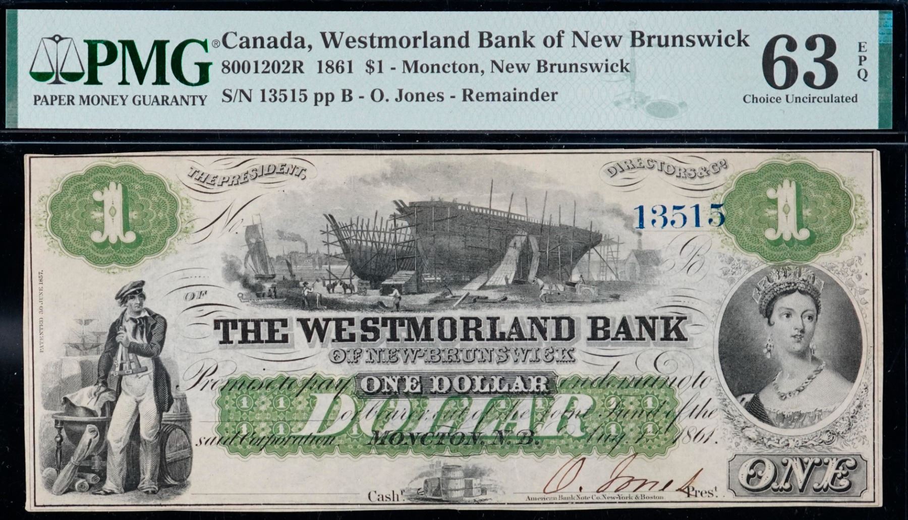 The Westmorland Bank of New Brunswick 1861 $1 #13515 CH-800-12-02R PMG Choice Uncirculated-63EPQ