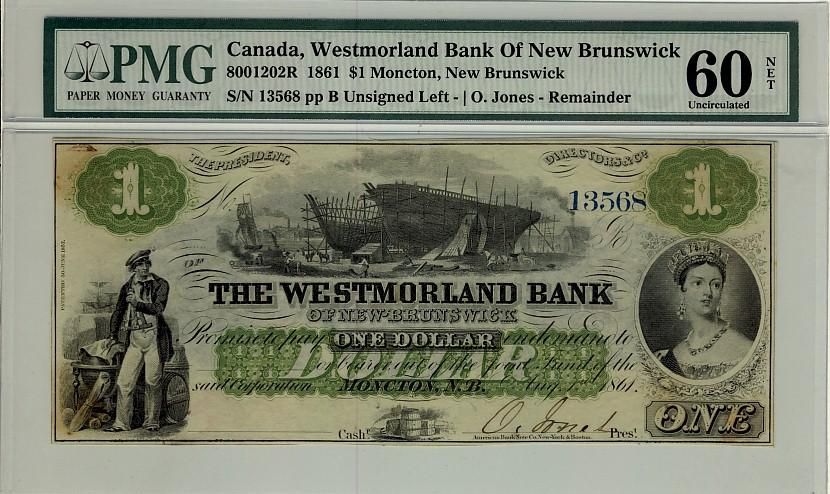 The Westmorland Bank of New Brunswick, 1861 $1 #13568, CH-800-12-02R, PMG UNC 60 NET
