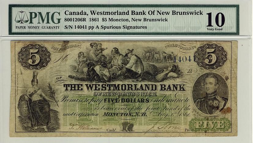 The Westmorland Bank of New Brunswick, 1861 $5 #14041 RADAR NOTE, CH-800-12-06R, PMG VG10