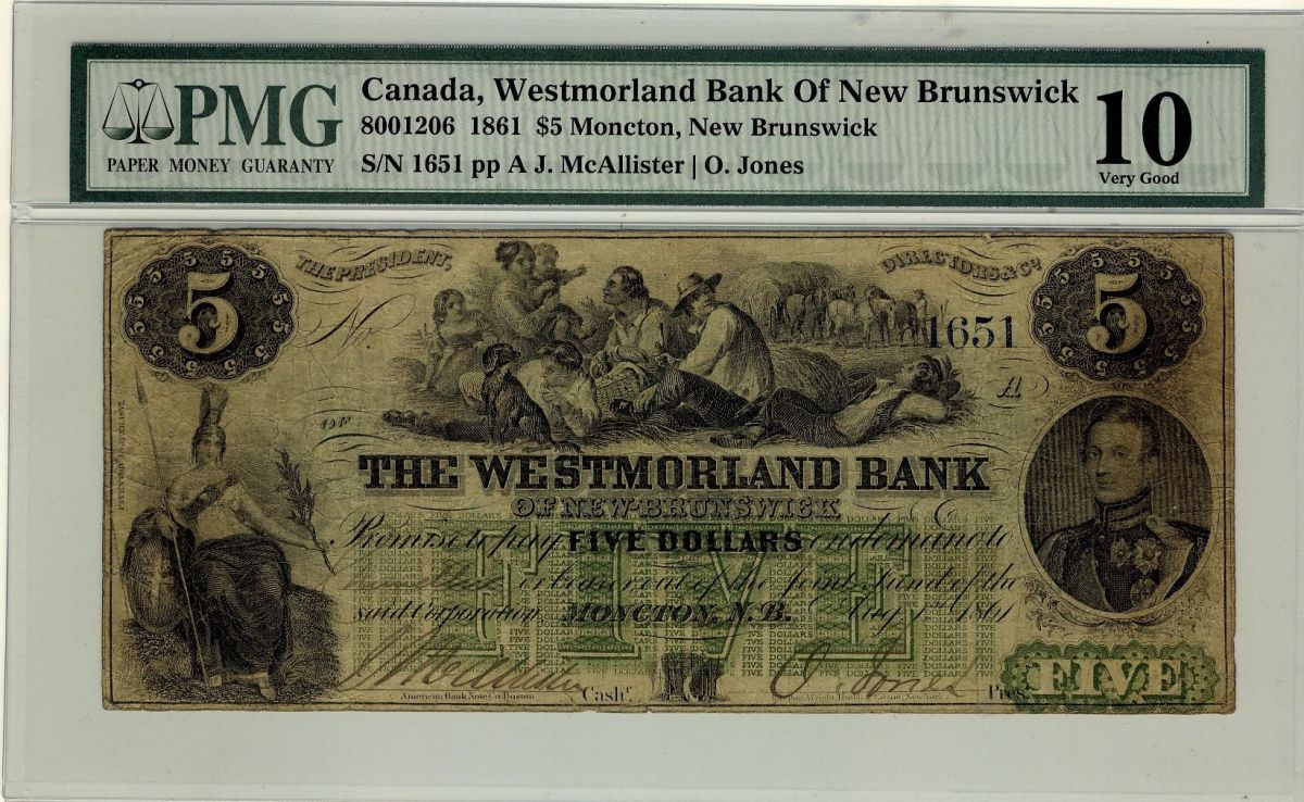 The Westmorland Bank of New Brunswick, 1861 $5 #1651, CH-800-12-06, PMG VG10