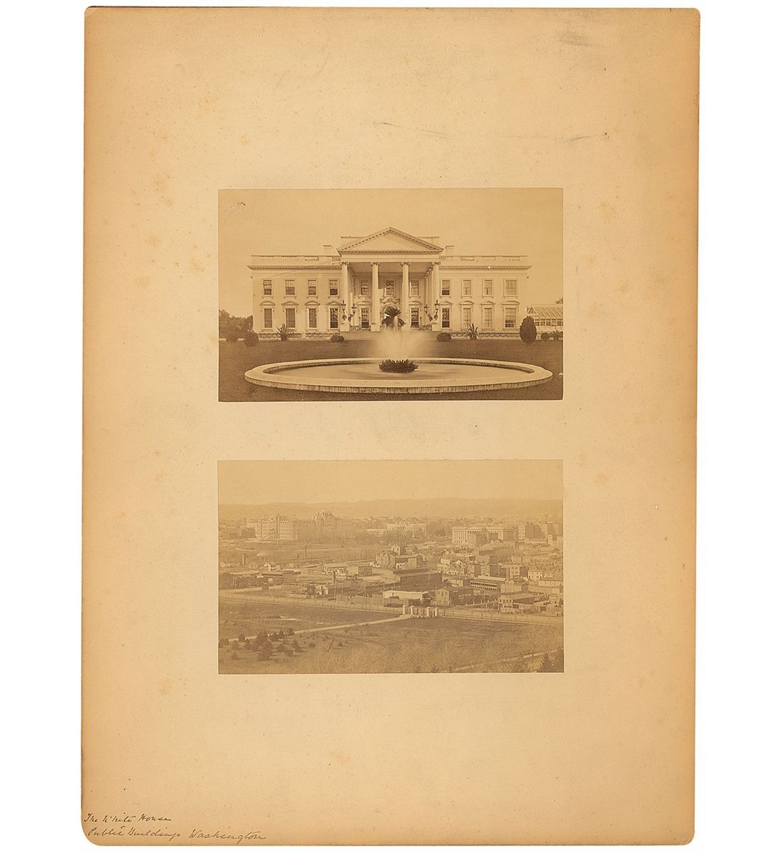 Original 19th century oversize mounted albumen photos, both 5.75 x 3.5, showing the US Capitol and White House in Washington D. C. Each is affixed to separate 11 x 14 mounts, with photos of the Public Buildings and Pennsylvania also affixed to the mounts, with notations to the bottom of each. General wear including toning, light foxing, edge wear and light staining on back.