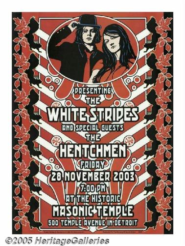 <B>The White Stripes Posters, Group of 2 (idealposters.com, 2003).</B></I> A beautiful pair of posters promoting The White Stripes playing two consecutive nights at Detroit's Masonic Temple. The first night's poster is by artist Dennis Loren, while the second night's poster is by Detroit native Gary Grimshaw. In Near Mint condition; these posters measure 13" x 17.5". Don't miss this chance to add these colorful posters to your collection!