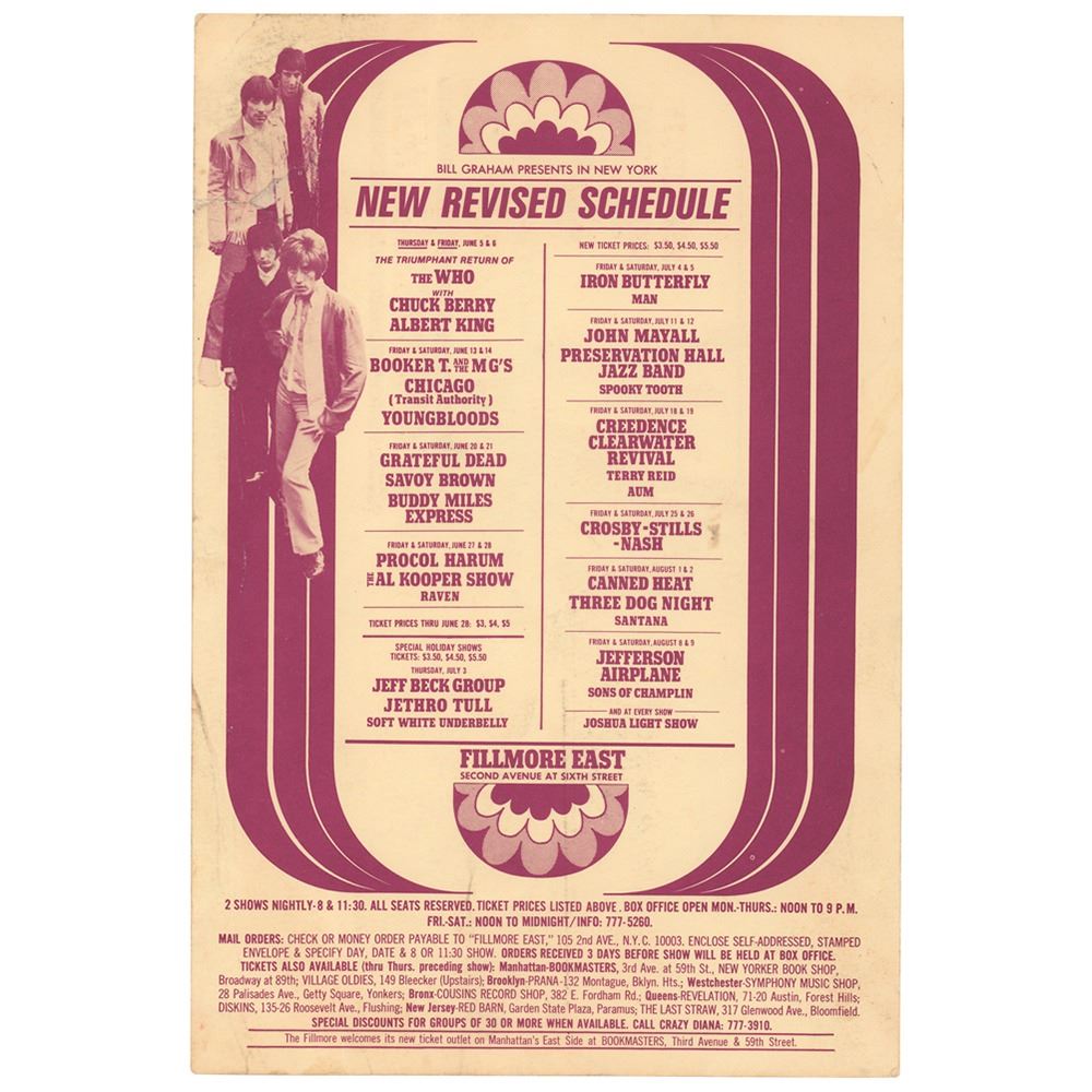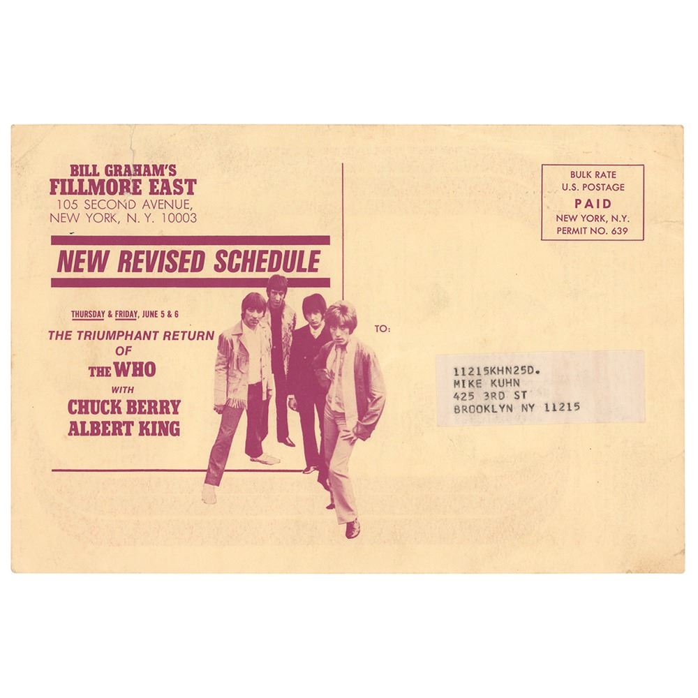 Original 6 x 9 postcard handbill promoting a “New Revised Schedule†of “Bill Graham Presents in New York†concerts held in June through August 1969, featuring bands like The Who, the Grateful Dead, the Jeff Beck Group, Jethro Tull, Procol Harum, Iron Butterfly, John Mayall, Creedence Clearwater Revival, Crosby, Stills & Nash, Canned Heat, Three Dog Night, Santana, Jefferson Airplane, and more. Postal section on reverse bears an affixed address label and an advertisement for “The Triumphant Return of The Who with Chuck Berry, Albert King.†In very good condition, with creasing to left side and a small tear passing through Moon's torso.