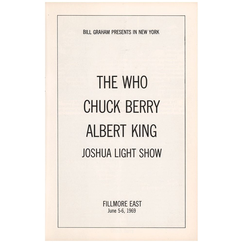 Concert program for The Who at the Fillmore East on June 5-6, 1969, only weeks before their triumphant performance at Woodstock. The program measures 5.5 x 8.5 and features many vintage advertisements, including two separate full-page announcements for The Who's Tommy; one for the single 'Pinball Wizard,' and the other for the album itself. Chuck Berry and Albert King are listed as the weekend's opening acts. In fine condition, with a central vertical light bend.