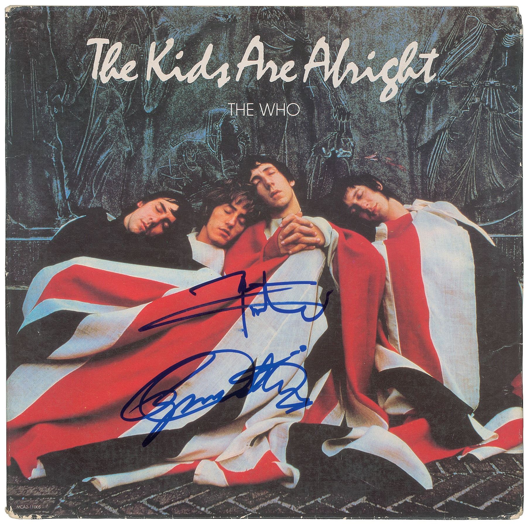 The Kids Are Alright soundtrack album by The Who, signed on the front cover in blue felt tip by Roger Daltrey and Pete Townshend. In fine condition, with slight wear to the corners. The record is not included.