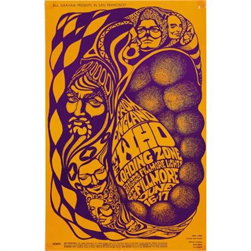 <B>The Who Fillmore Concert Poster BG-68 (Bill Graham, 1967).</B></I> Pete Townsend and company barreled through San Francisco like a hurricane, leaving a path of destruction (courtesy madman drummer Keith Moon). Here's a fantastic, Bonnie MacLean-designed poster for that event, which also included the Loading Zone. Of special note is the listing for next week, in small type in the lower right corner -- Jimi Hendrix, who would be making his Fillmore debut! What a time to be in SF! This first-printing poster measures approximately 14" x 22", and is in VG- condition due to tape residue on the corners, and a light fold.<BR><BR><b>Shipping:</b> Flat Material, Large (<a target="_blank" href="http://www.heritageauctions.com/common/shipping.php">view shipping information</a>)