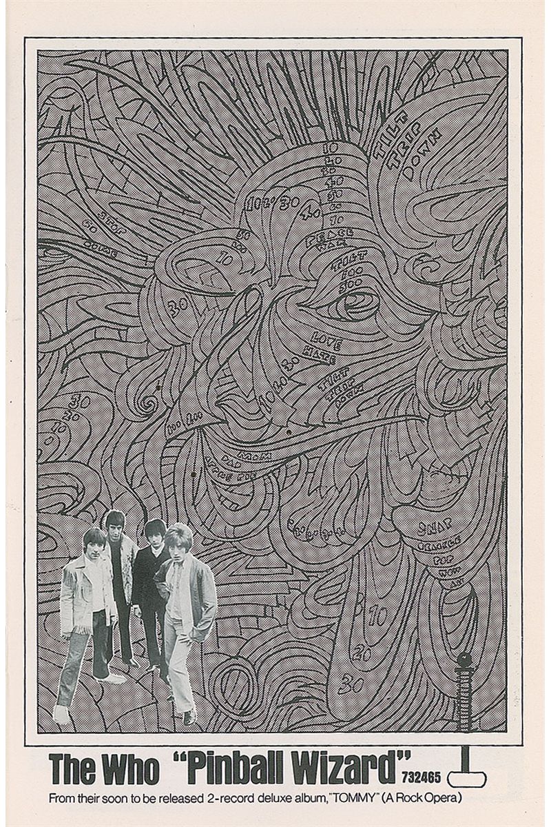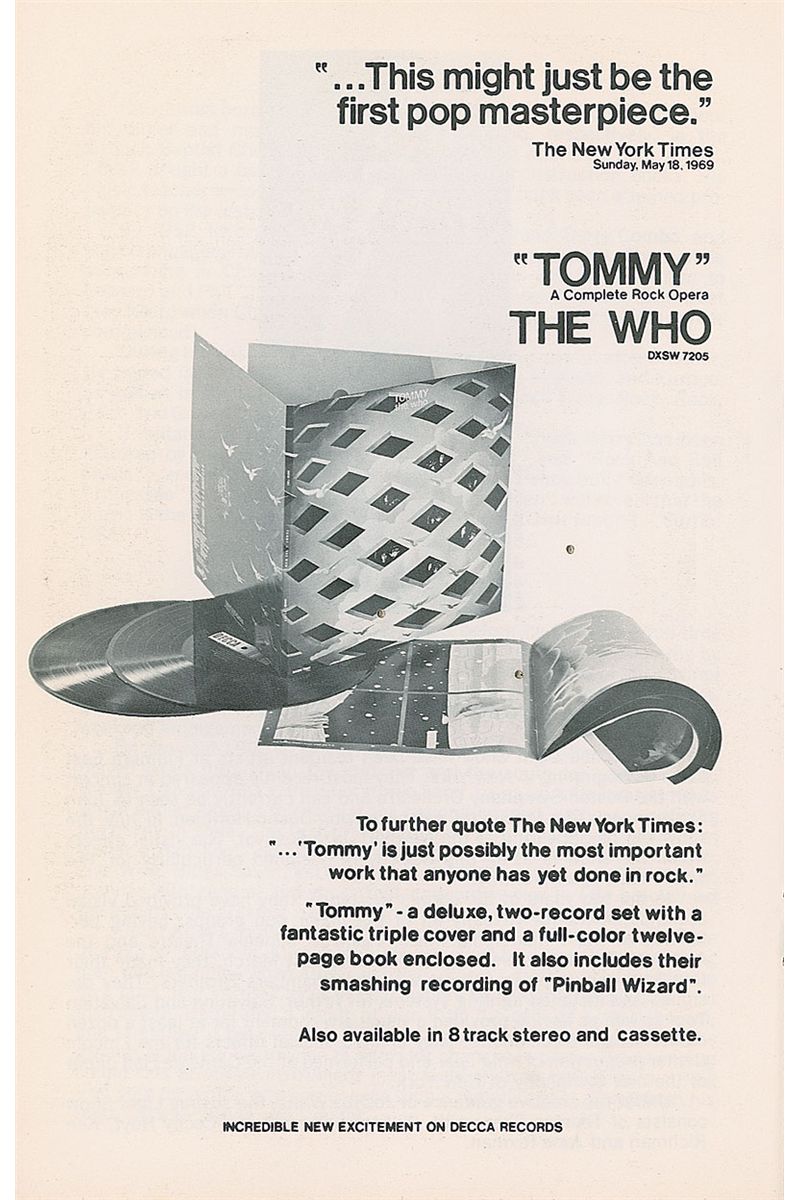 Concert program for The Who at the Fillmore East, on June 5–6, 1969, including biographies and images of The Who and other performers, which included Chuck Berry and Albert King. Also featured are two full-page ads for 'Pinball Wizard' and Tommy. Three small central holes, otherwise fine condition.