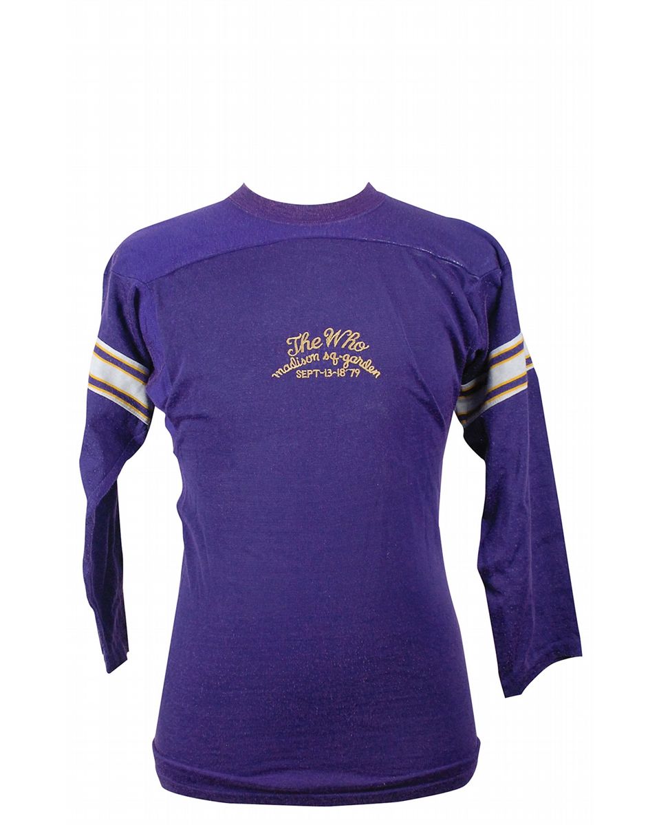 Stage-worn football jersey style shirt, worn on stage by the band’s saxophonist Howie Casey. Purple long-sleeve shirt has purple gold, and white stripes near the shoulders, and is embroidered in the center of the chest, “The Who / Madison Sq. Garden / Sept 13-18 ’79.” In fine condition, with expected light wear and soiling.