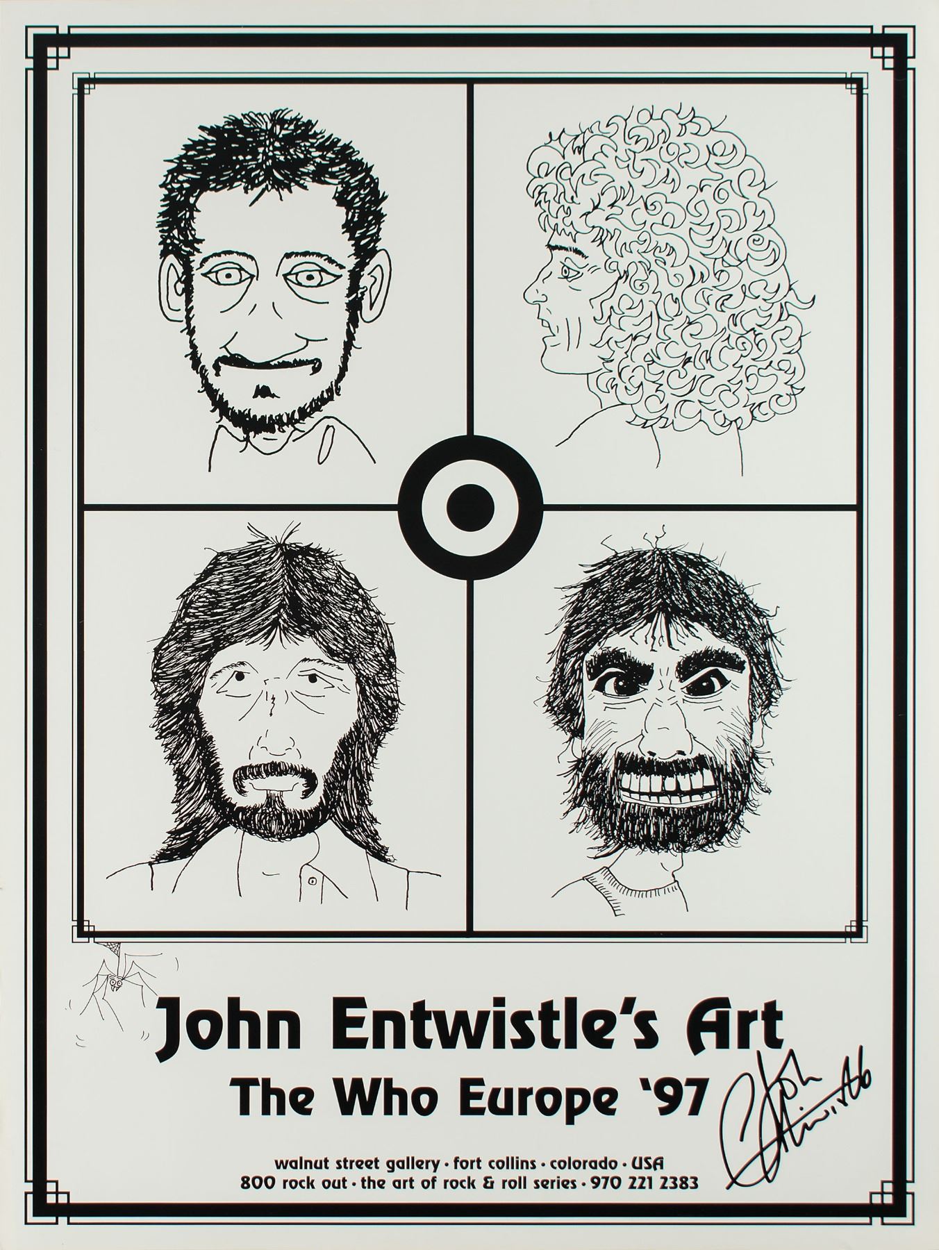 Uncommon 18 x 25 poster of "John Entwistle's Art" presented at the Walnut Street Gallery in Fort Collins, Colorado, which depicts the bass player's drawings of each band member from their 1997 European Tour, signed in the lower right in black felt tip by Entwistle. In fine condition.