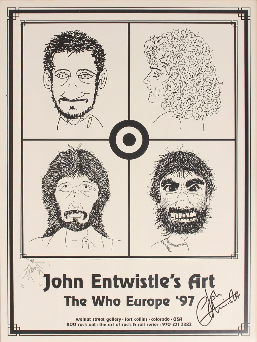 Uncommon print of artwork by John Entwistle created for The Who’s 1997 European tour, 18 x 24, depicting the four band members, signed in the lower right corner in black felt tip by Entwistle. In fine condition.