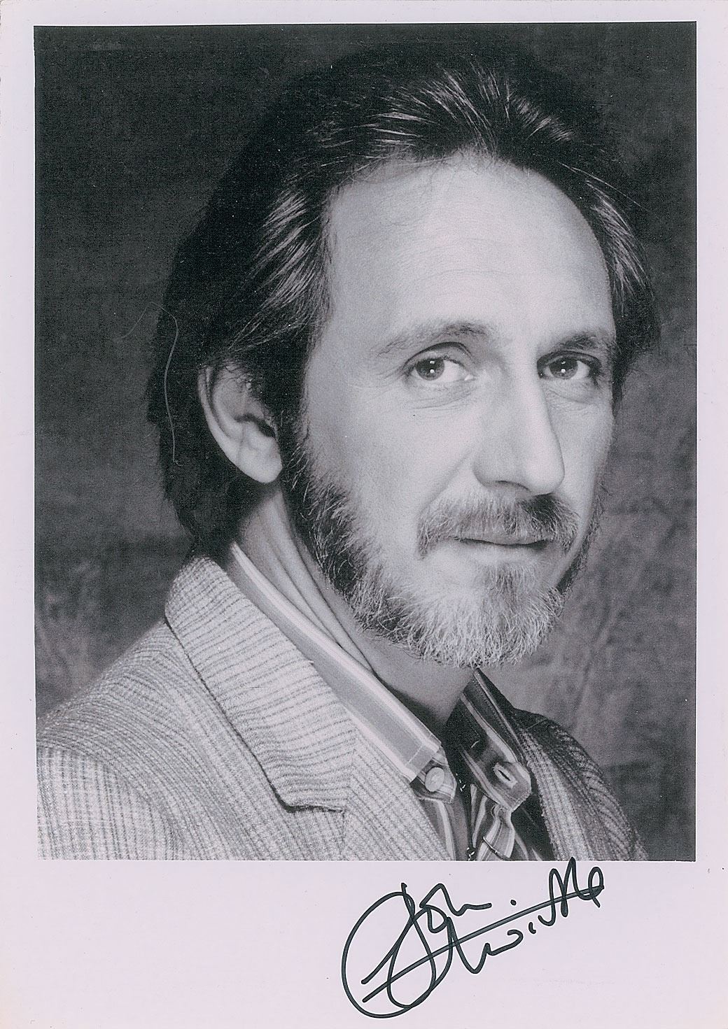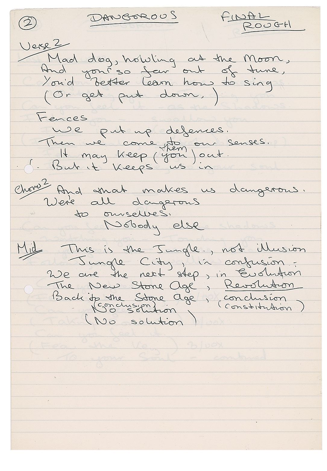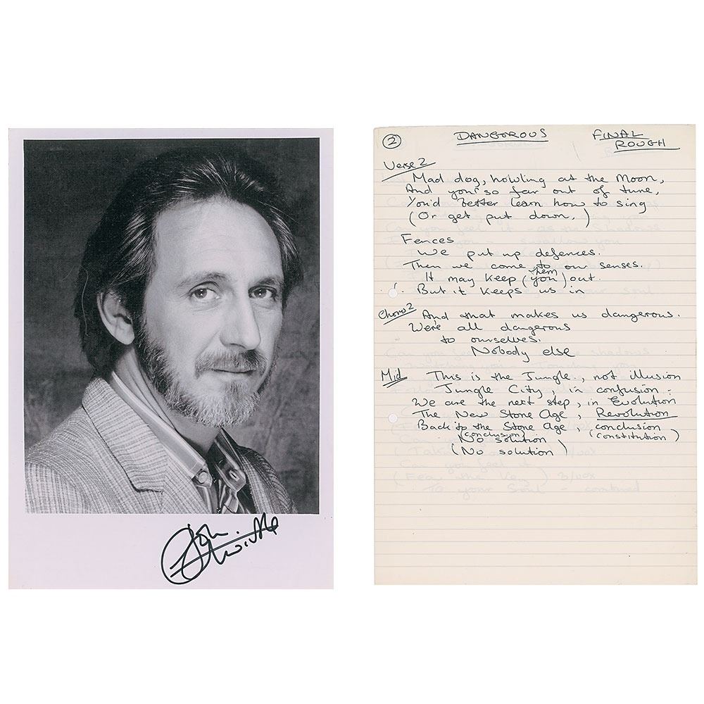 Handwritten rough draft of lyrics for "Dangerous" by John Entwistle, two pages, 8.25 x 11.75, marked "Final Rough" and numbered as pages "2" and "3." The draft starts with "Verse 2," beginning, "Mad dog, howling at the Moon, / And your so far out of tune, / You'd better learn how to sing / (Or get put down)." On the last page, the "Last intro verse" begins: "Can you feel it—in the shadows / watching you—touching you / Can you feel it—as the shadows / Follow you—swallow you." Also includes a glossy 8.25 x 11.75 portrait of Entwistle, signed in the lower border in black felt tip. In fine condition. 'Dangerous' first appeared on The Who's 1982 album It's Hard, Entwistle's last album with the group.