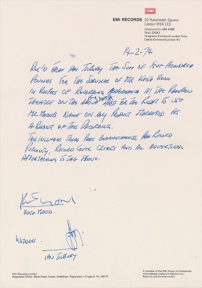 Manuscript DS, signed “Keith Moon,” one page, 8.25 x 11.75, EMI Records letterhead, February 14, 1974. In full: “Rec’d from Ian Tilbury the sum of Five Hundred Pounds for the services of Mr. Keith Moon in respect of recording a performance at the Rainbow Theatre on the above date and for the right to use Mr. Moon’s name on any product marketed as a result of this recording. This includes trade press announcements, pre record publicity, record cover credits and all advertising appertaining to the above.” Signed at the conclusion in blue ink by Moon. In fine condition.
